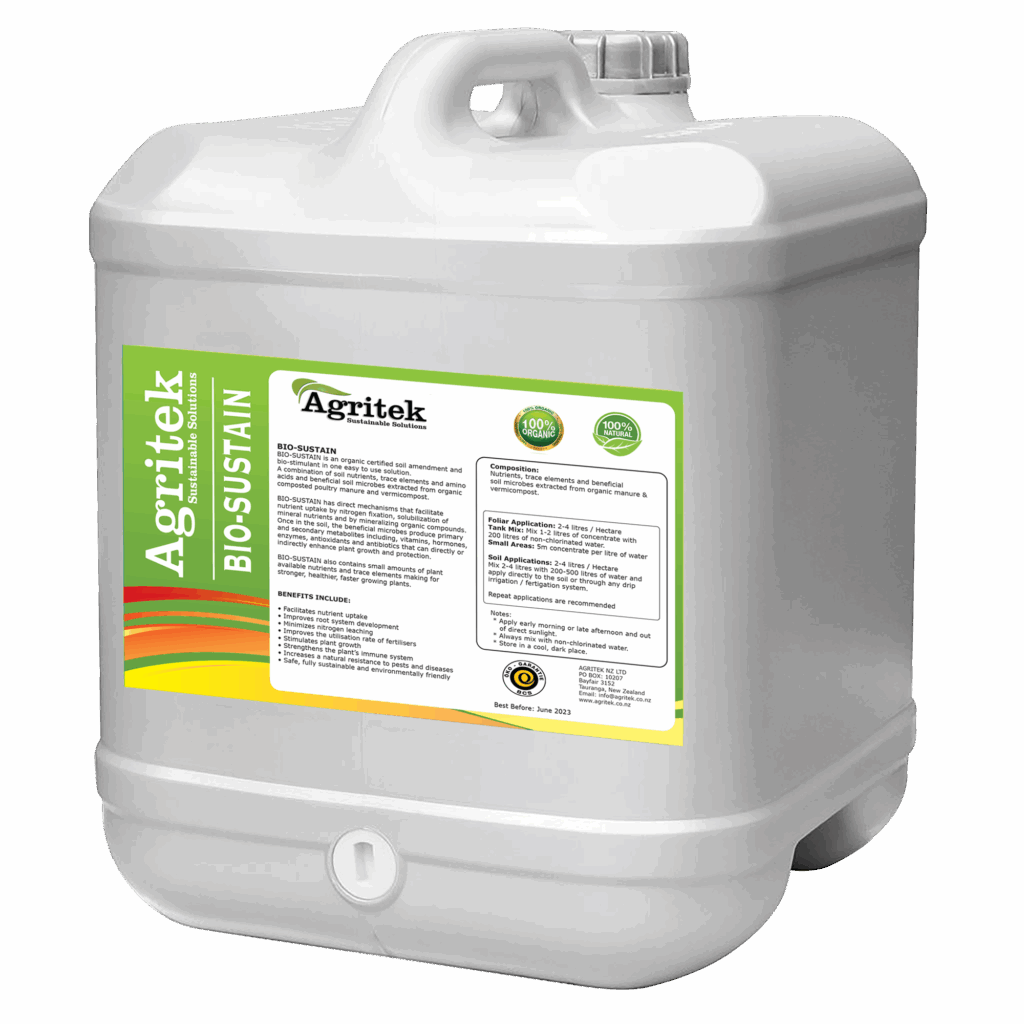 BIO-SUSTAIN is a liquid Bio-fertiliser, bio-stimulant and soil amendment in one easy to use solution. It contains beneficial soil microbes that facilitate the uptake of NPK and other minerals by converting them into forms that the plant can easily absorb. It increases biological activity in the soil rhizosphere helping increase nutrient uptake, water use efficiency, drought tolerance and plant disease resistance. The beneficial microbes in BIO-SUSTAIN also produce metabolites including, enzymes, antioxidants, vitamins, hormones and antioxidants that directly or indirectly enhance plant growth and protection. BIO-SUSTAIN also contains small amounts of nutrients making for stronger, healthier, faster growing plants